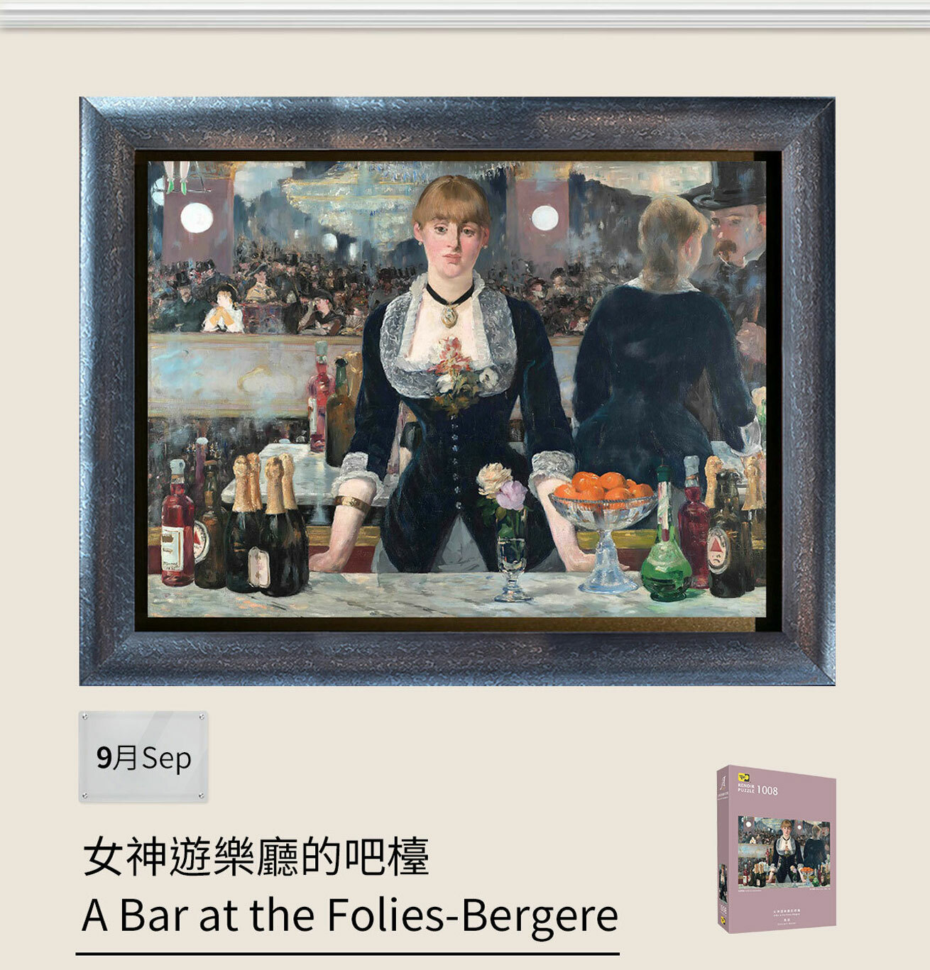 愛德華‧馬奈(1832-1883)出生於巴黎。他以鬆散的筆法,在畫布上直接塗抹顏色,而非傳統逐層混合顏料。其技法呈現相對平坦的感覺,被認為是現代藝術的特徵。他的作品常暗示諷刺意味、大膽裸露、將底層階級畫成神話人物等,畫作當時毀譽參半。直到他過世後,其藝術貢獻才被認可。畫面中,從侍女身旁的鏡面反射,能發現她與客人看似熱絡地交談,但侍女的神情又十分冷漠。此畫的獨特構圖,在展出後一百多年,仍不斷被討論虛像與現實的關係。