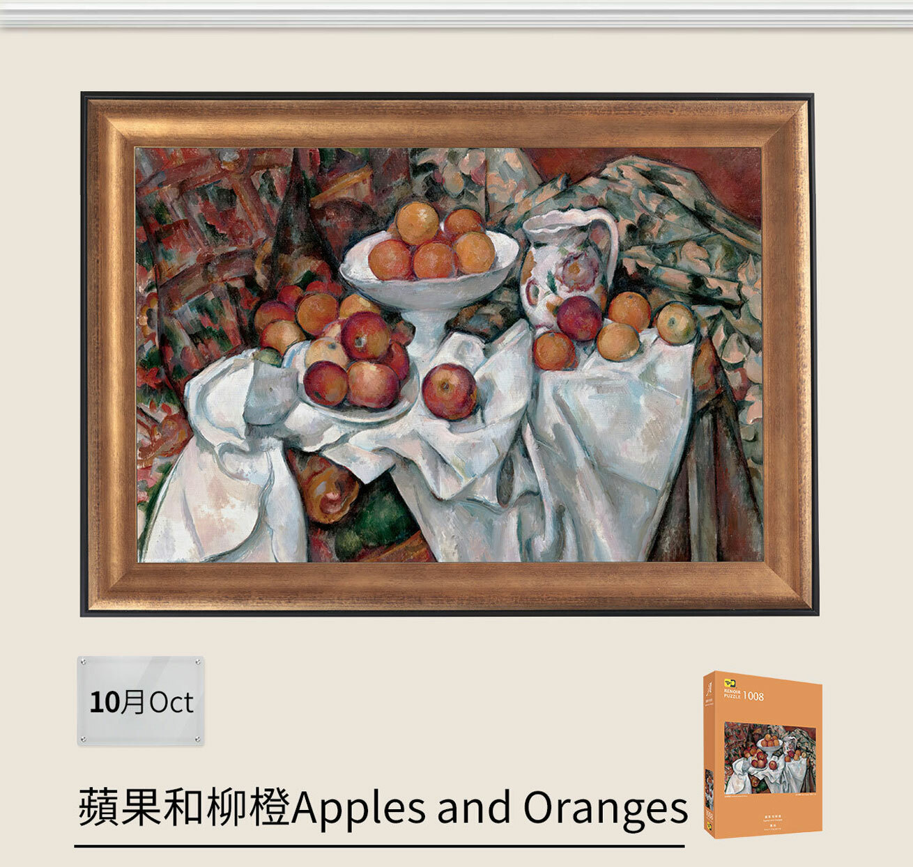 法國後印象派畫家賽尚(1839-1906)充分發揮對色彩和空間的獨特處理,展現「色彩的結構力量」的信念。其作品對立體主義和20世紀現代藝術影響深遠,被譽為現代藝術之父。這幅畫中,塞尚展示了顏色和形狀相互作用的重要。他重新安排構圖,簡化物體形式組成圖案。桌子框架和牆面消失了,三維空間、垂直與水平的區別變得模糊。在這裡,塞尚追求元素的連續性,白布中似乎長出水果盤,花瓶的圖紋彷彿與蘋果、柳橙以及背後布幕融合,形狀和色彩意想不到的和諧。