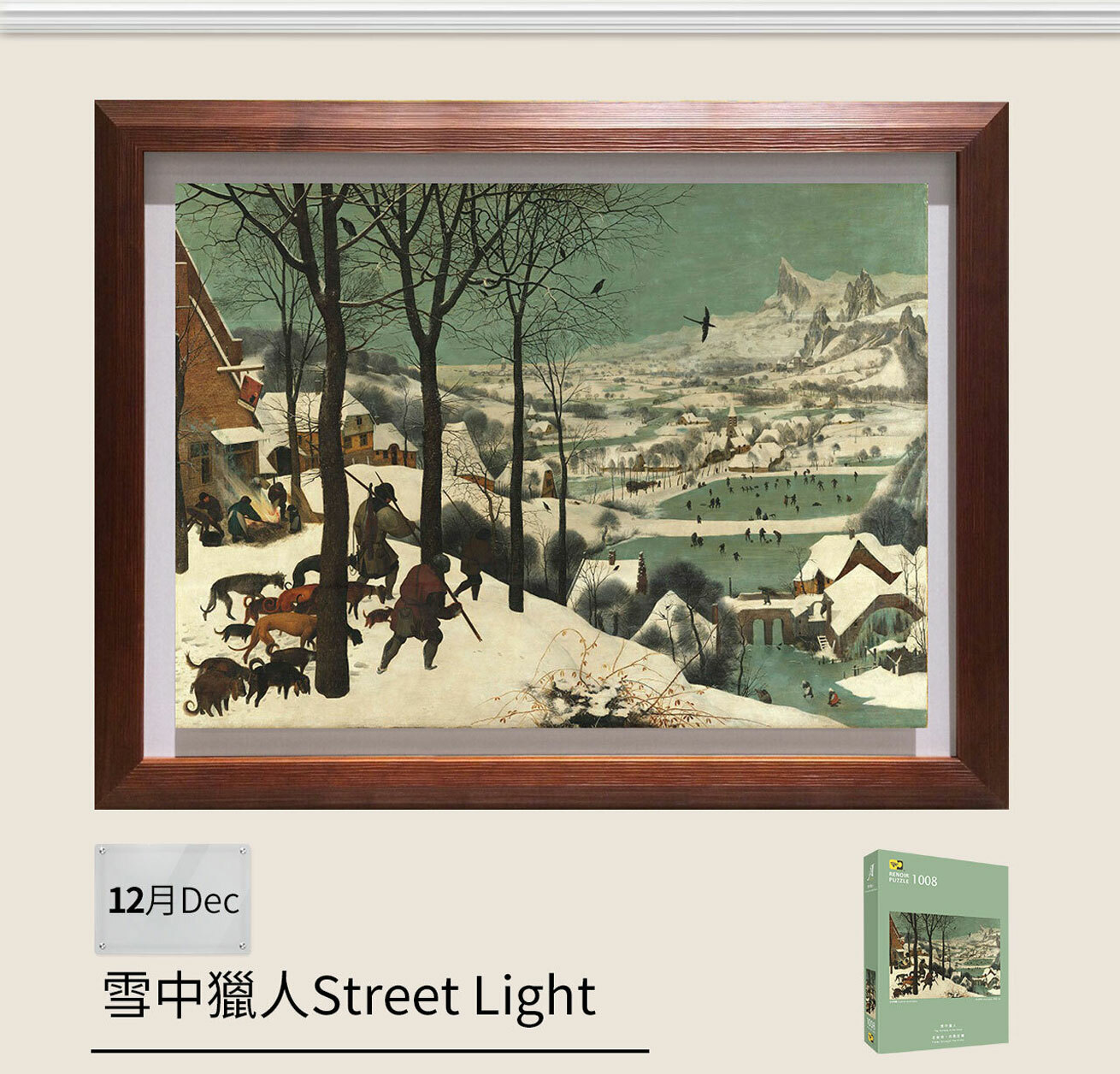 布勒哲爾(1525-1569)以廣闊的風景畫、農民生活場景和宗教寓言聞名,他的作品不僅反映了當時社會的變遷,還預示了歐洲繪畫的新方向。他是歐洲北方文藝復興時期最具影響力的人物之一。這幅〈雪中獵人〉從左下方高地開始,傾斜對角線的構圖引領觀眾往右側遠方眺望。遠方蜿蜒的河流已凍結,遙望人們在冰上嬉戲的縮影,似乎可聽見他們細微的笑語迴盪在風中。布勒哲爾透過以大到小的比例重現世界,他紀錄人類生活的日常活動,但又常常在一瞬間看到世界全貌。